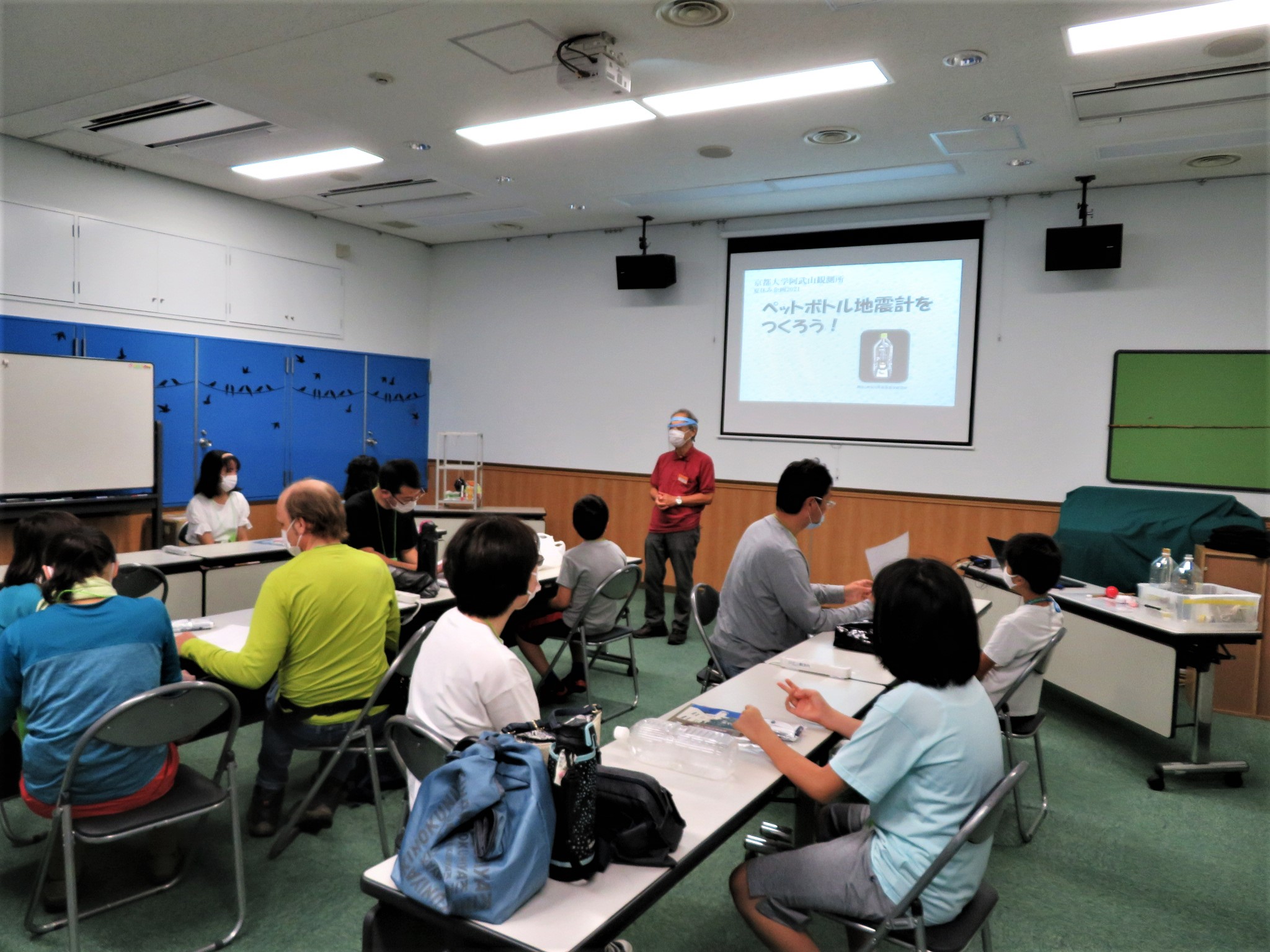 京都大学阿武山観測所からは、毎年恒例のペットボトルを使った地震計の工作を提供しています。プログラムは「地震はどうして起こるのか」や「地震計のしくみ」などの解説と、本物の地震計を使って地震記録を観察してもらいました。