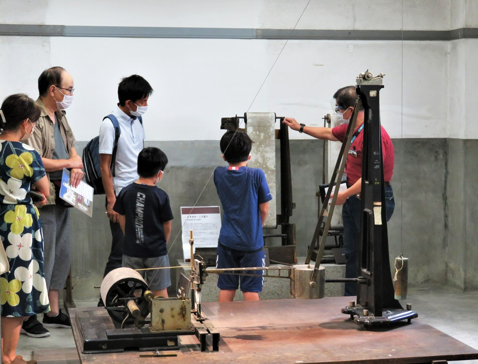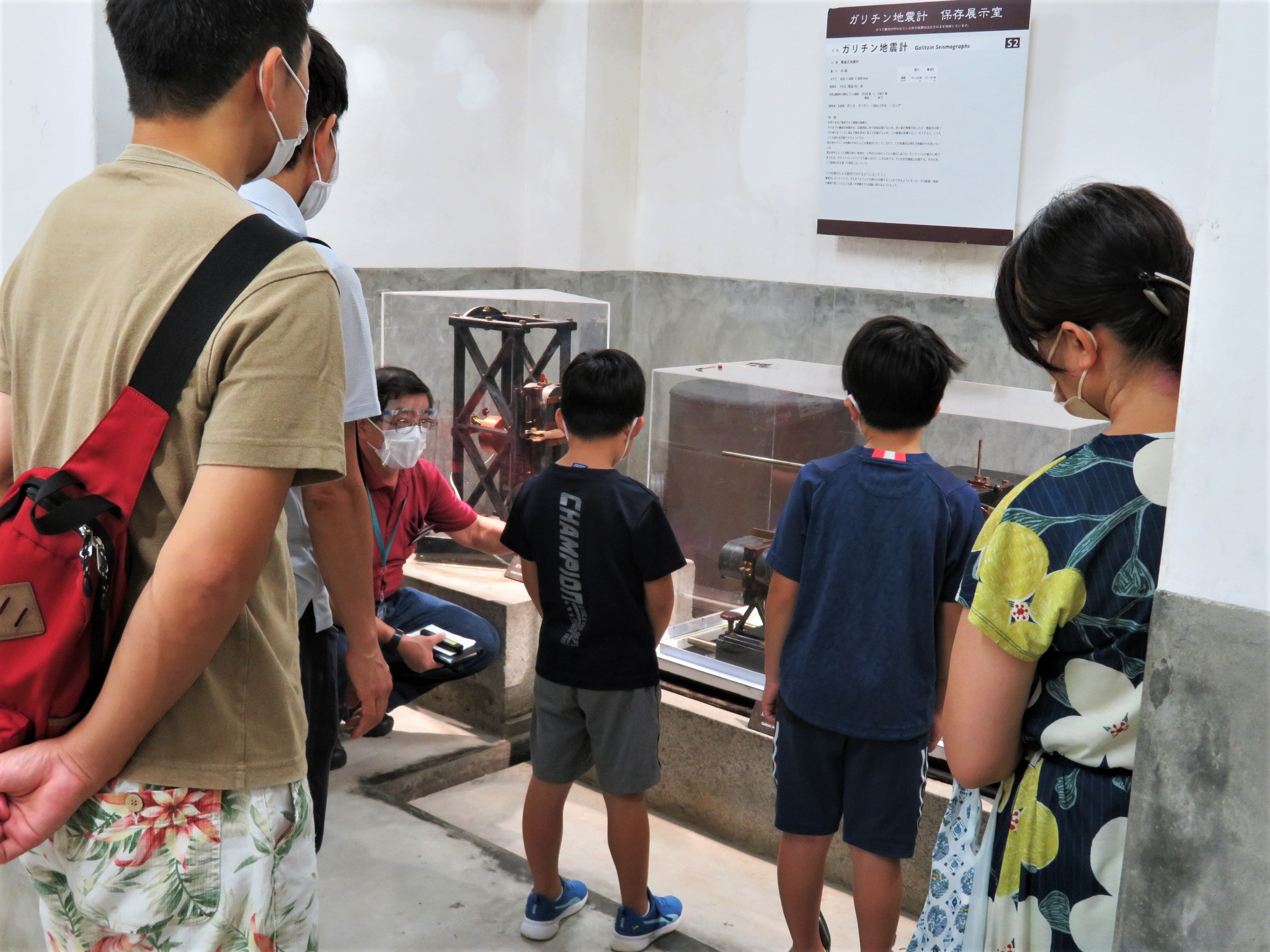 世界で最初の電磁式のガリチン地震計(子どもさんが興味深々でした)